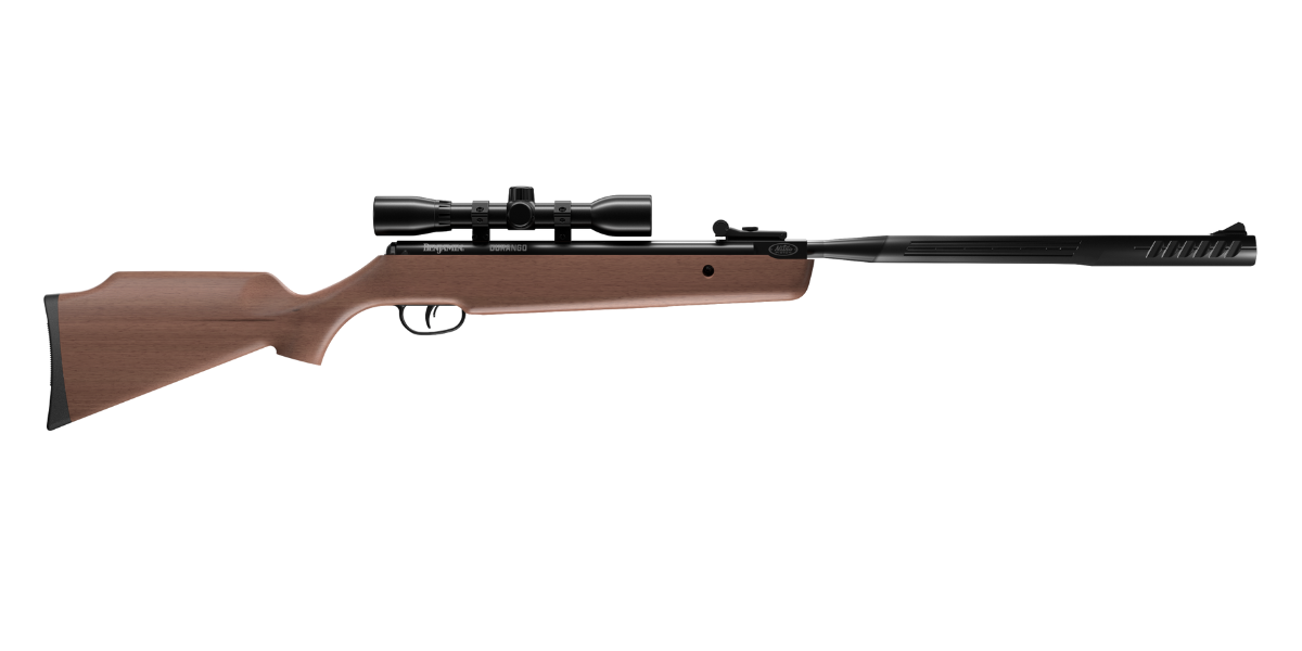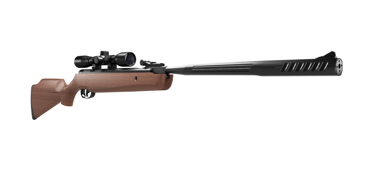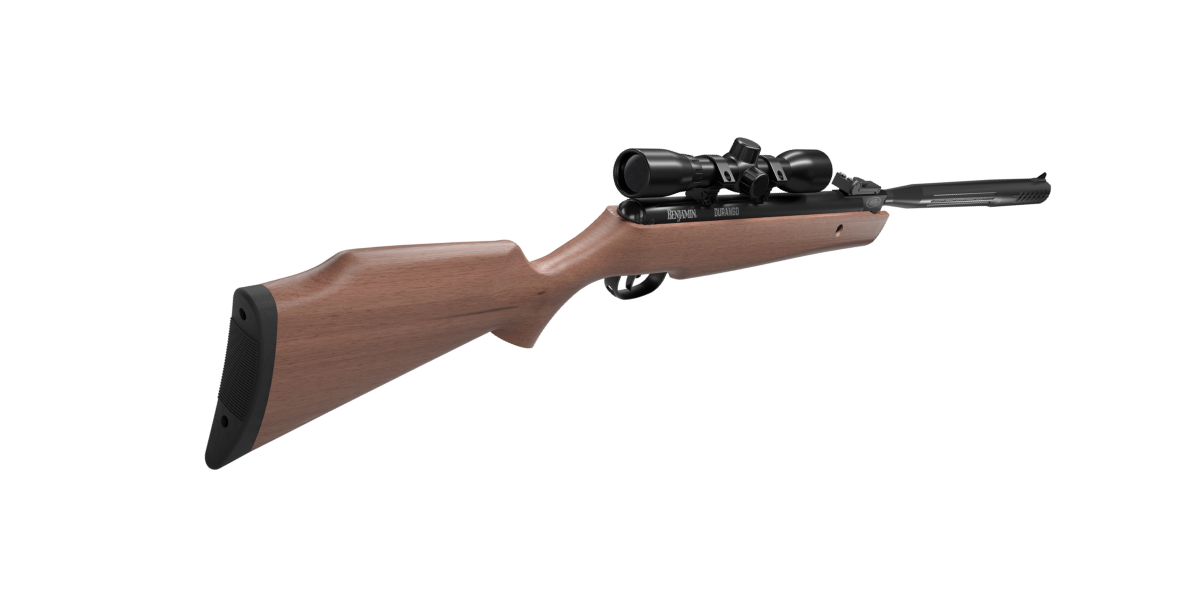 The Benjamin Durango .22 break barrel air rifle boasts a lighter and smoother cocking force than others in its class. The Durango shoots with 70% less noise and less recoil thanks to Nitro Piston technology. This rifle includes QuietFire sound suppression technology, two-stage adjustable trigger, classic wooden stock, rifled steel barrel, and 4x32mm scope. Shoots alloy pellets at speeds of up to 1200 fps (.177).