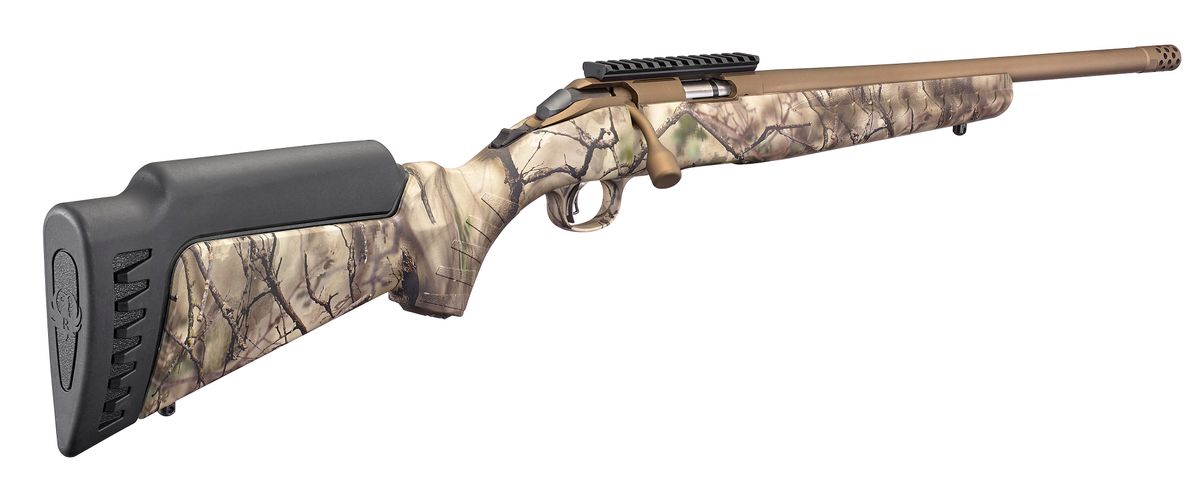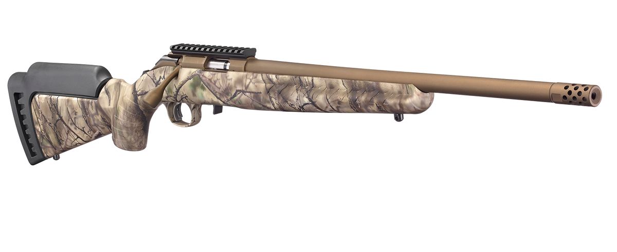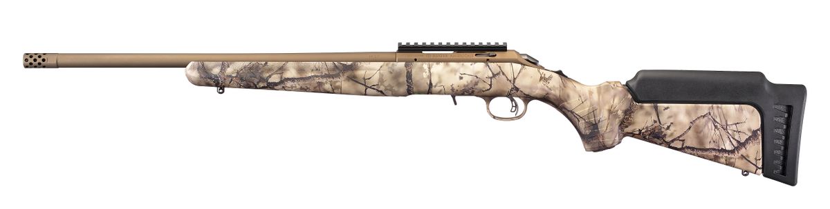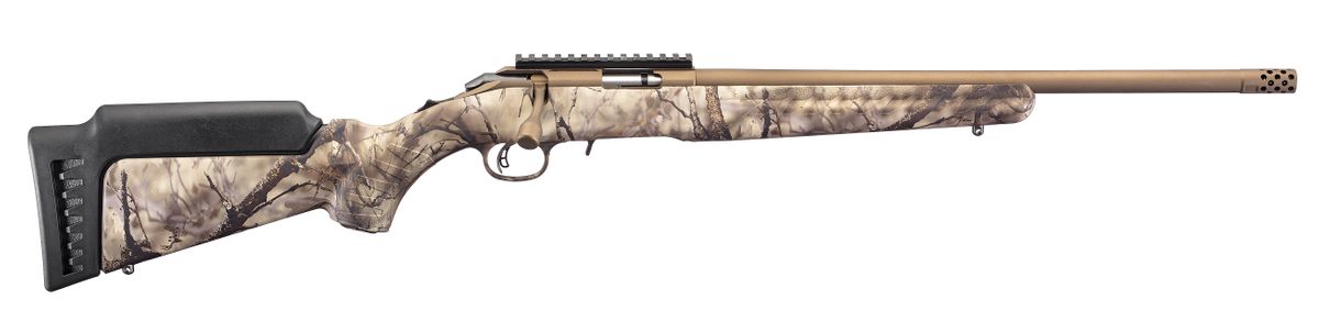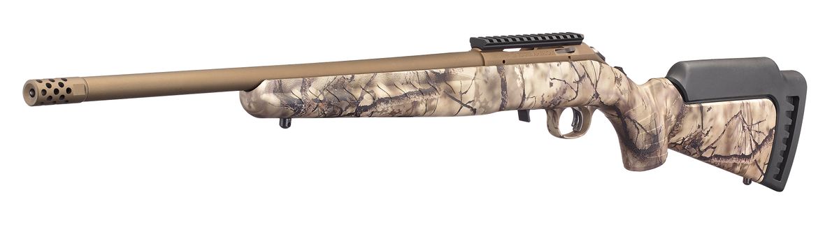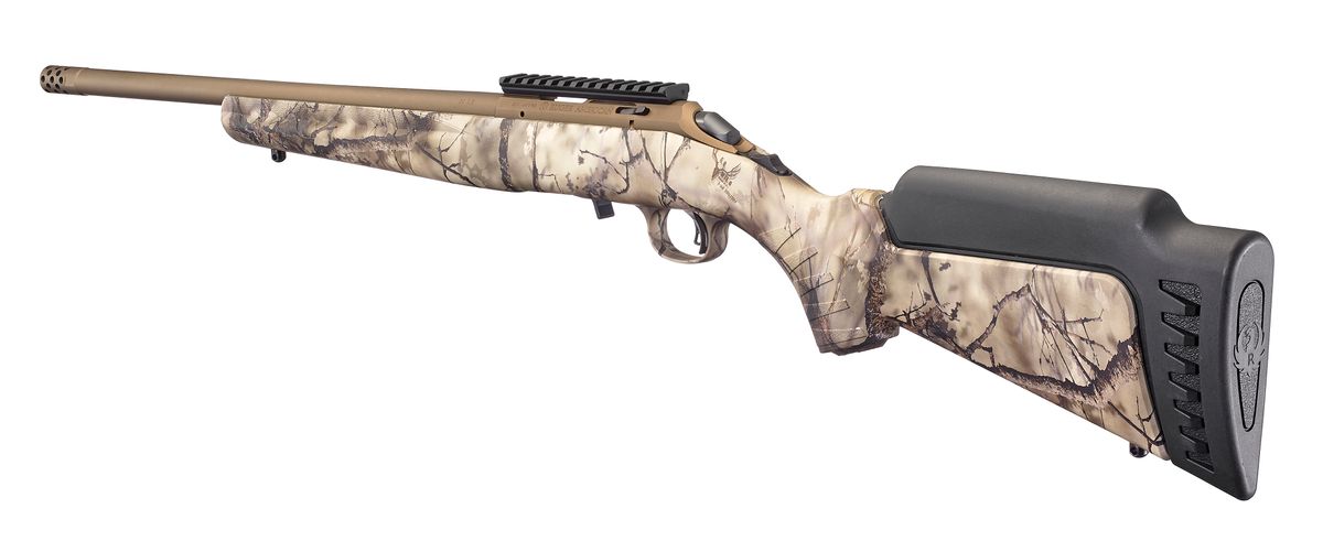 The Ruger American Rimfire Go Wild Camo has a threaded barrel with factory installed muzzle brake. The barrel is cold hammer-forged, resulting in ultra-precise rifling that provides exceptional accuracy and longevity. Includes interchangeable standard length of pull, high comb stock module ideal for use with optics. By simply removing the rear sling swivel stud, you can change the stock module in seconds. Compact stock modules are also available.