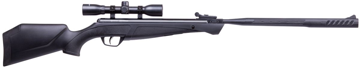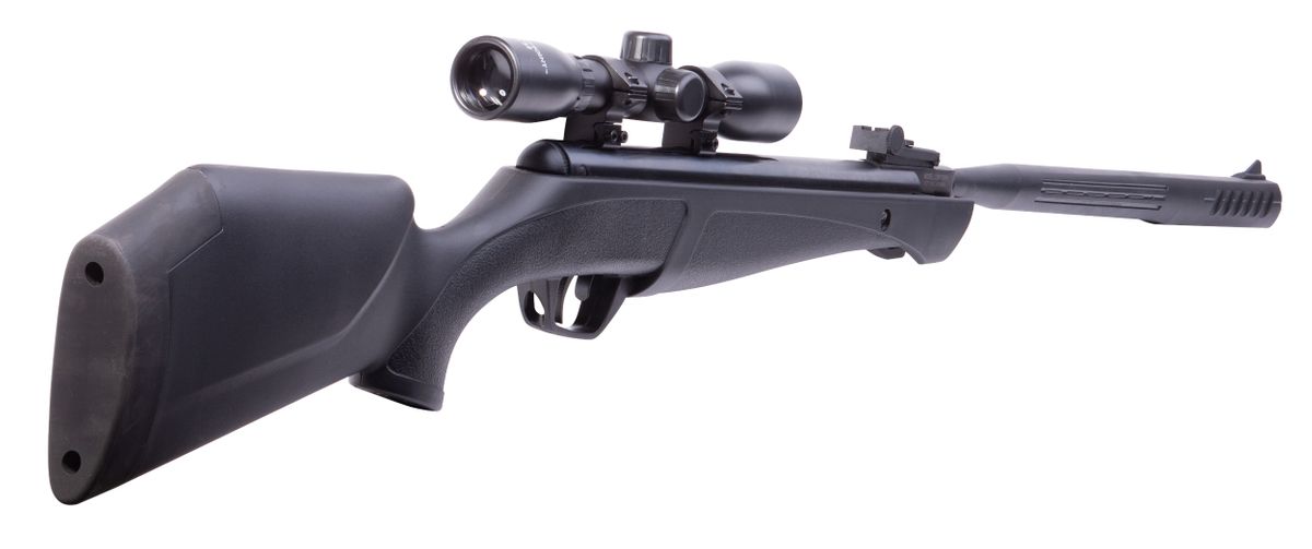The Crosman® Shockwave break barrel air rifle boasts a lighter and smoother cocking force than others in its class. The Shockwave shoots with 70% less noise thanks to Nitro Piston technology and has less recoil. This rifle includes QuietFire sound suppression technology, a two-stage adjustable trigger, a 4x32mm scope, and a sturdy all-weather synthetic stock and foregrip. It also has a rifled steel barrel. The Shockwave produces speeds up to 1200 fps (.177) and provides power and accuracy in a modern design.