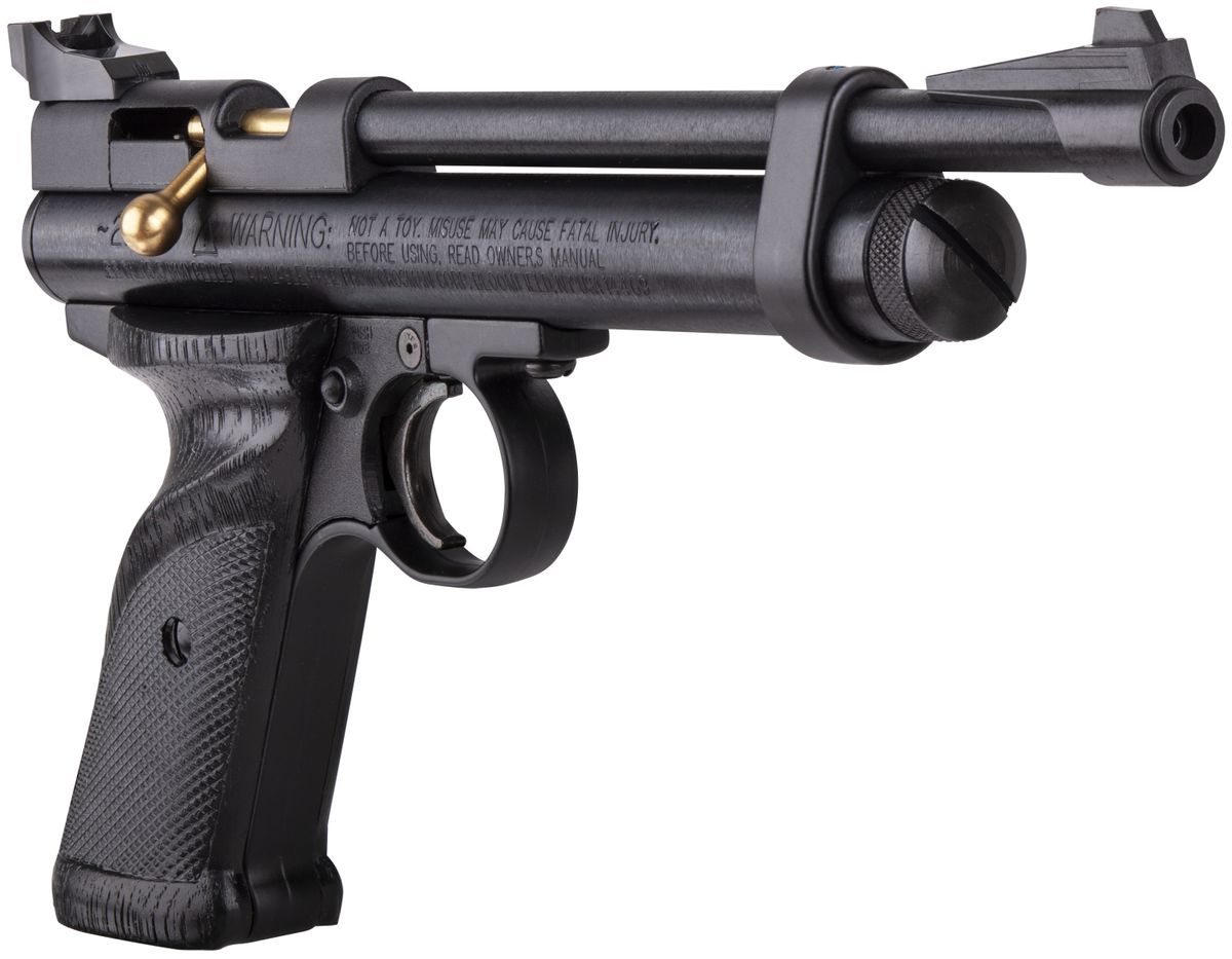This .22 caliber air pistol features an improved bolt design for easier cocking and loading. The steel barrel is rifled for increased precision, and the 12 gram Powerlet's CO2 power delivers 460 feet per second of power. An excellent pistol for plinking, target shooting, or tiny pests. An ambidextrous grip with checkering and a thumbrest on each grip panel fits the hand perfectly for balance and comfort. The back sight is adjustable and open.