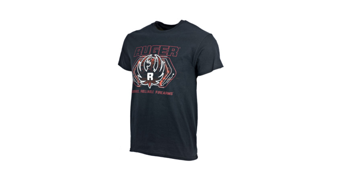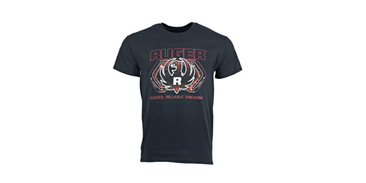 100% cotton, 5 oz, soft breathable fabric black short sleeve t-shirt with Ruger design front and back. Made by Club Red.