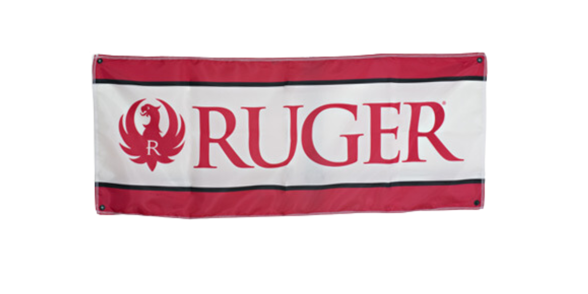 Uniquely Ruger branded, White/Red polyester, 2'x5' banner. It has a brass grommet located in each corner and 5' of polyester rope attached to each one. Made in the USA by World Division.