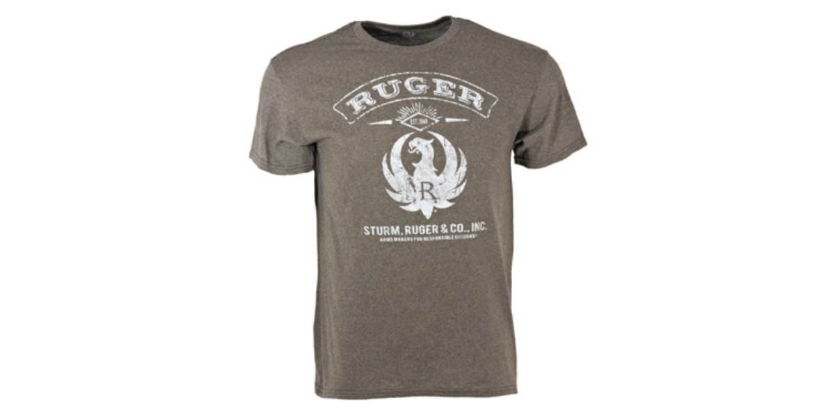 5.2 oz., 100% pre-shrunk cotton heather brown short-sleeved tee. Features include taped neck and shoulder seams for durability, two-needle hemmed sleeves and bottom that won't unravel, and a seamless rib knit collar.